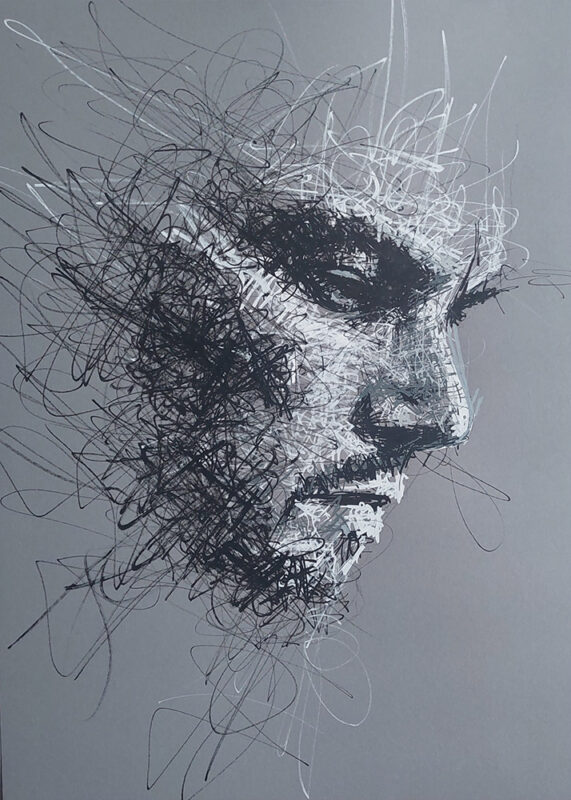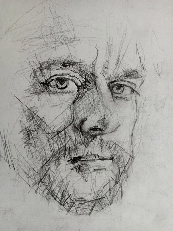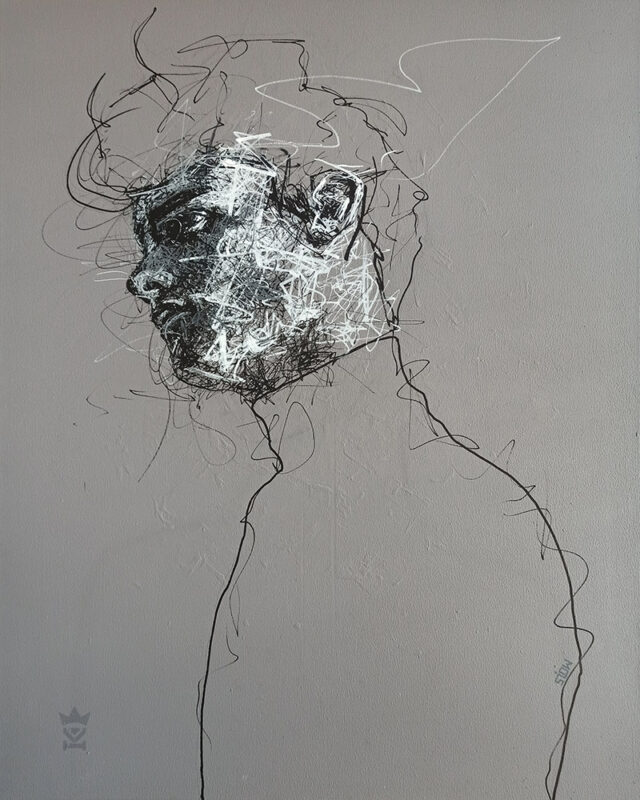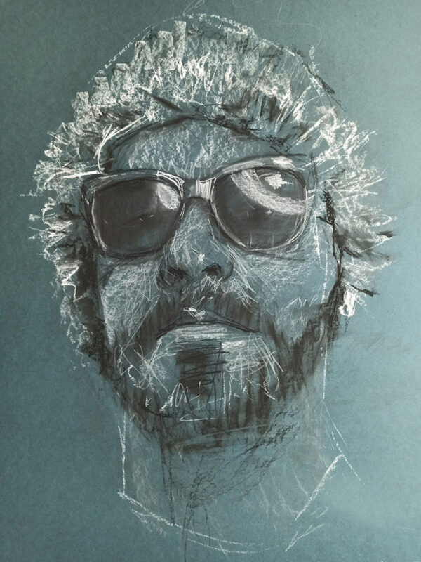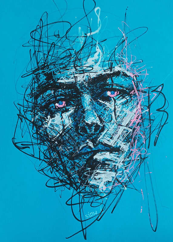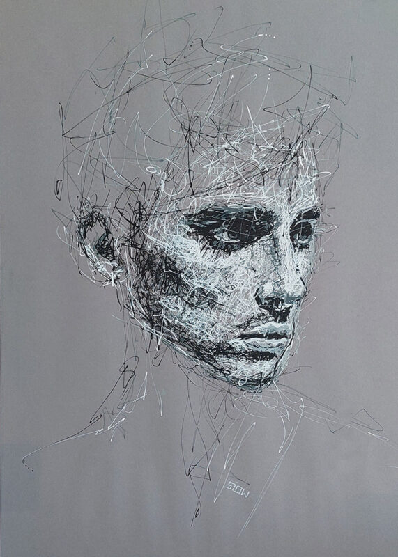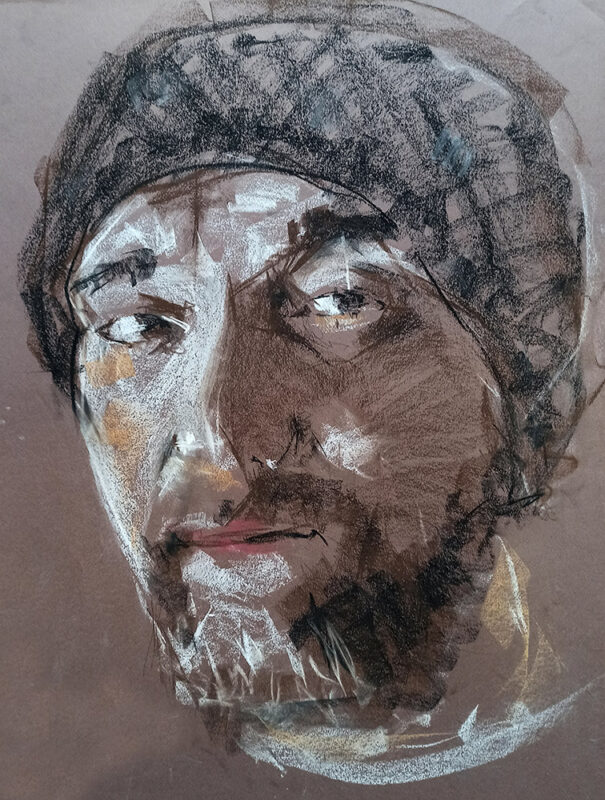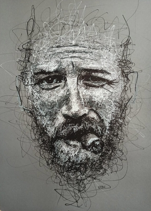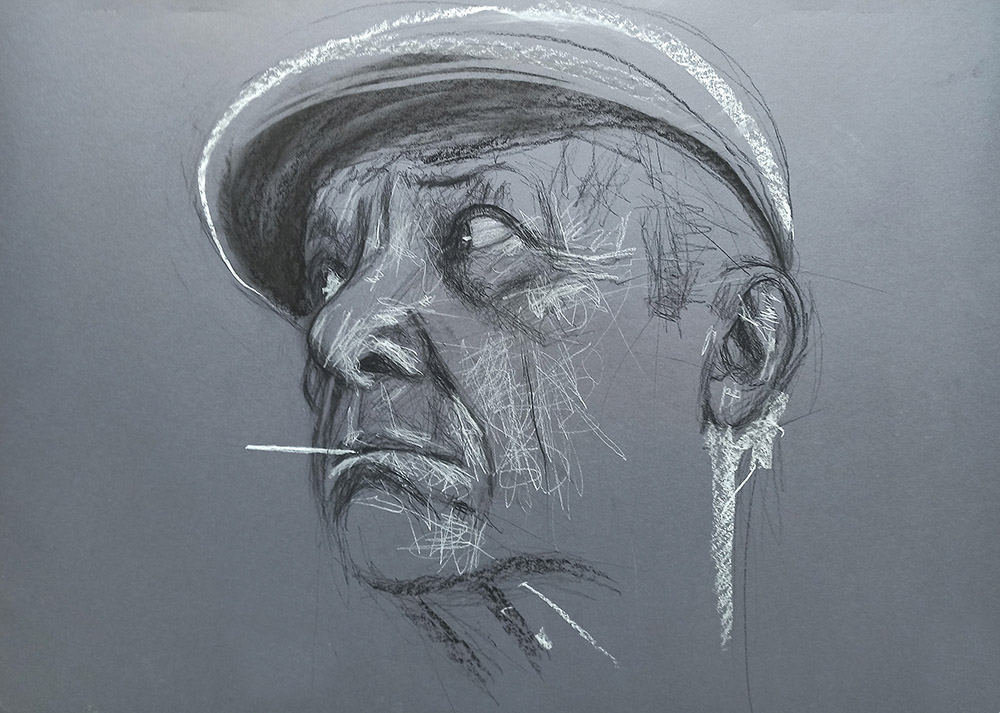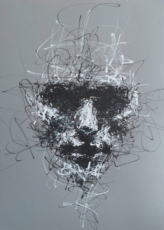 Siow Portrait Mann mit Zahnstocher im Mund in schwarz-weiß Pastell